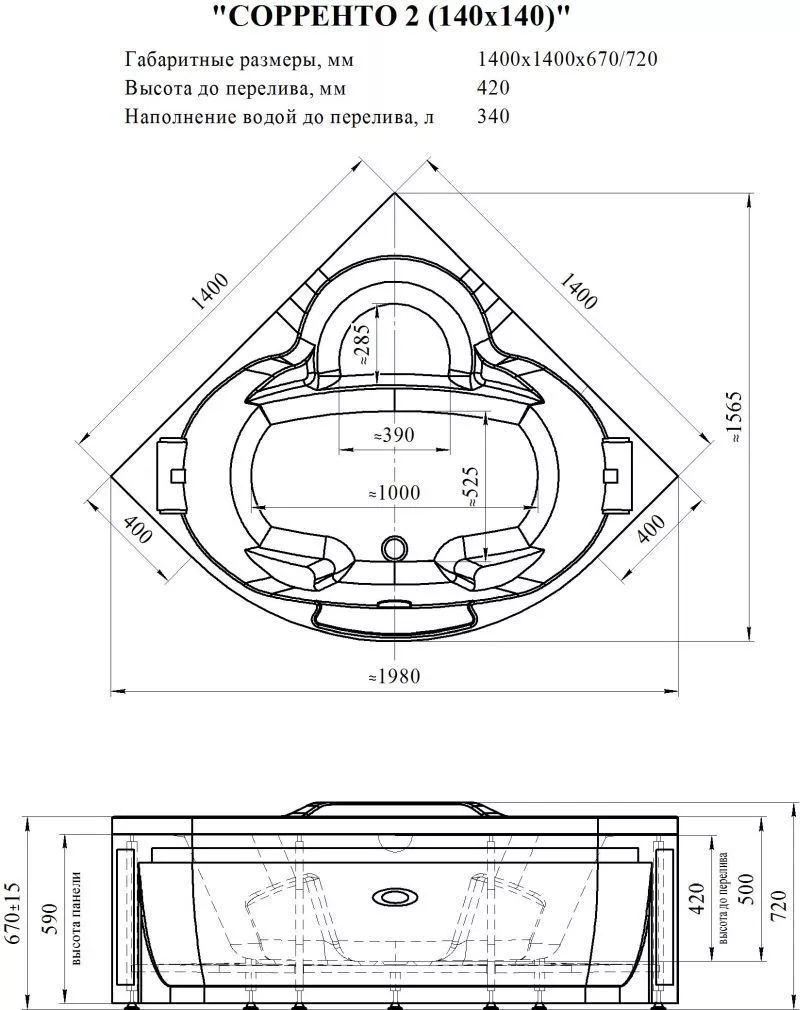 Акриловая ванна «Сорренто» 140х140 отличается практичной формой и анатомическим внутренним строением. Благодаря угловой конструкции изделие компактно размещается в ванной комнате любой планировки.