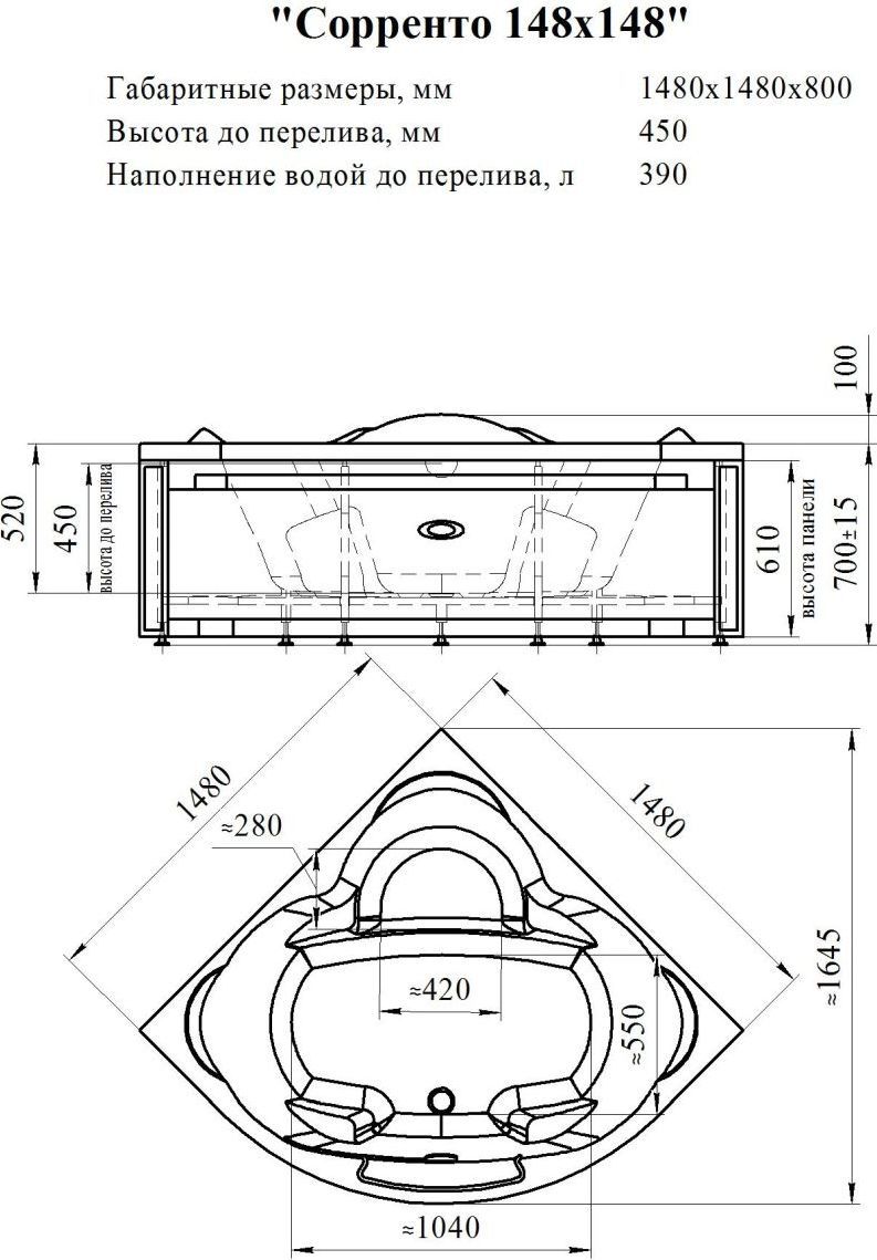 Отличным примером не только функционального, но и потрясающе привлекательного изделия является вместительная акриловая ванна с угловой конструкцией «Сорренто» 148х148.
