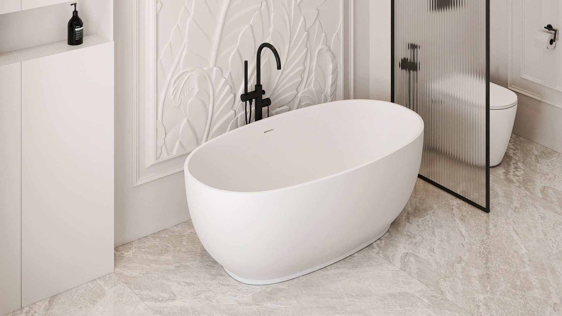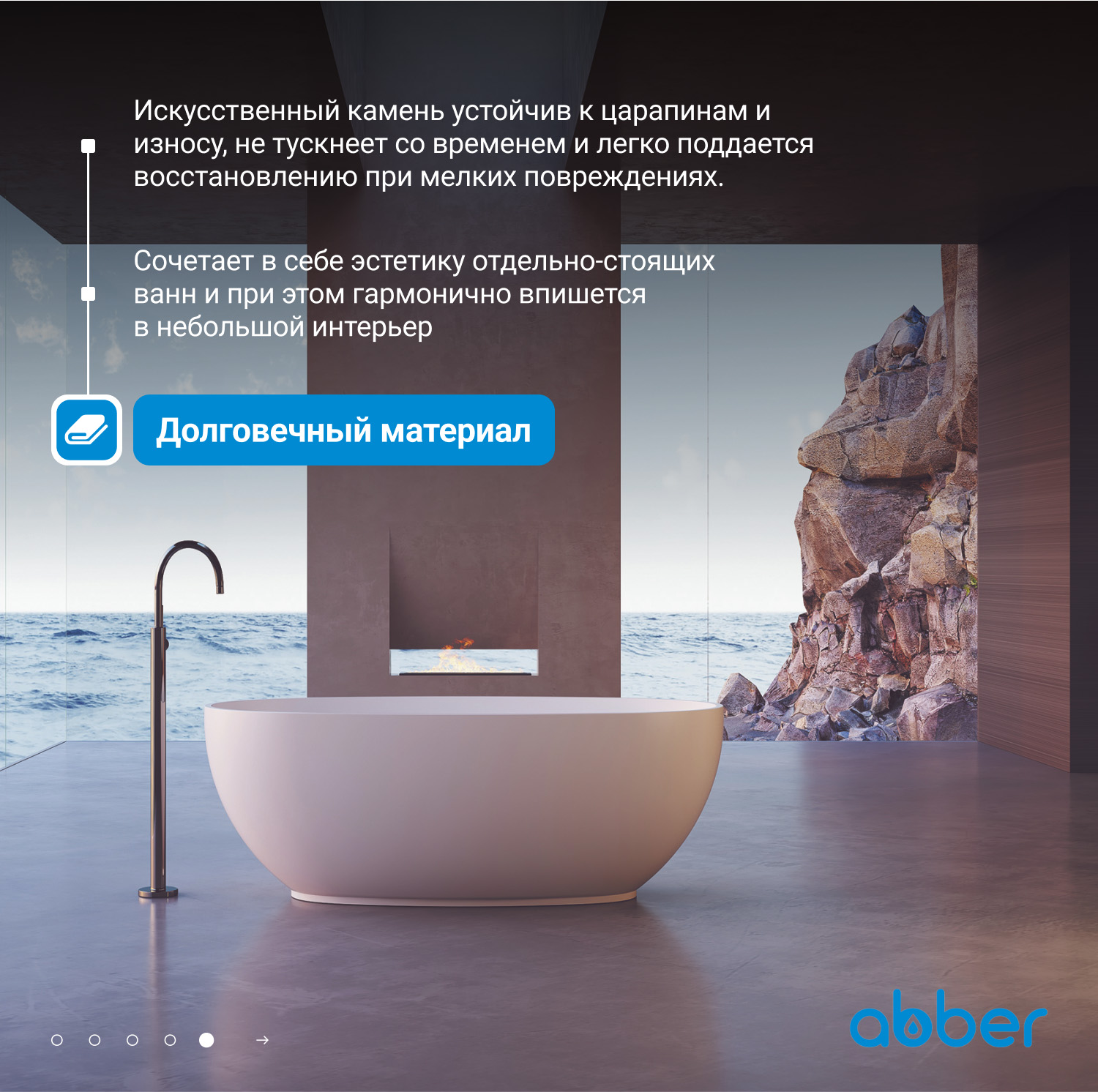 Ванна каменная Abber Stein, размер 140x78 см, слив-перелив в комплекте, цвет белый матовый.