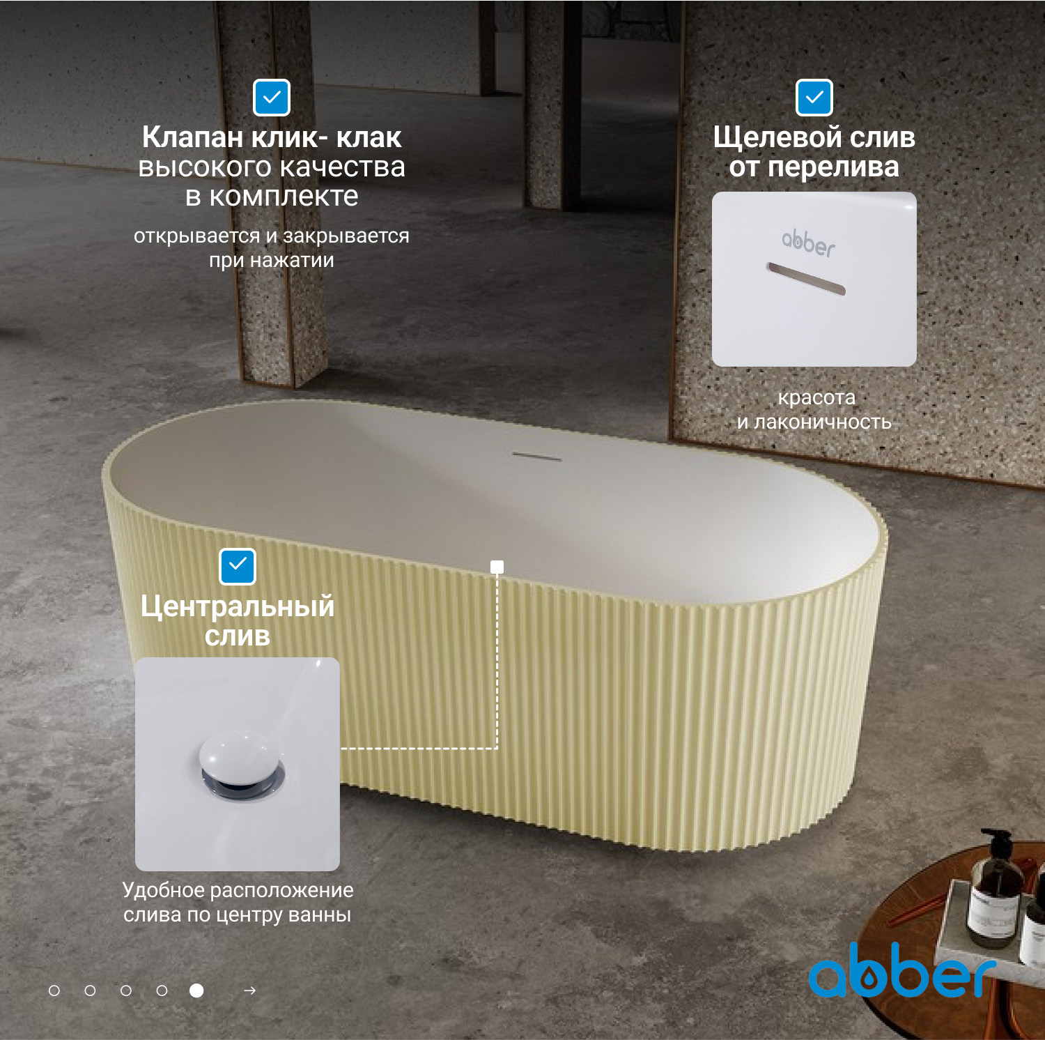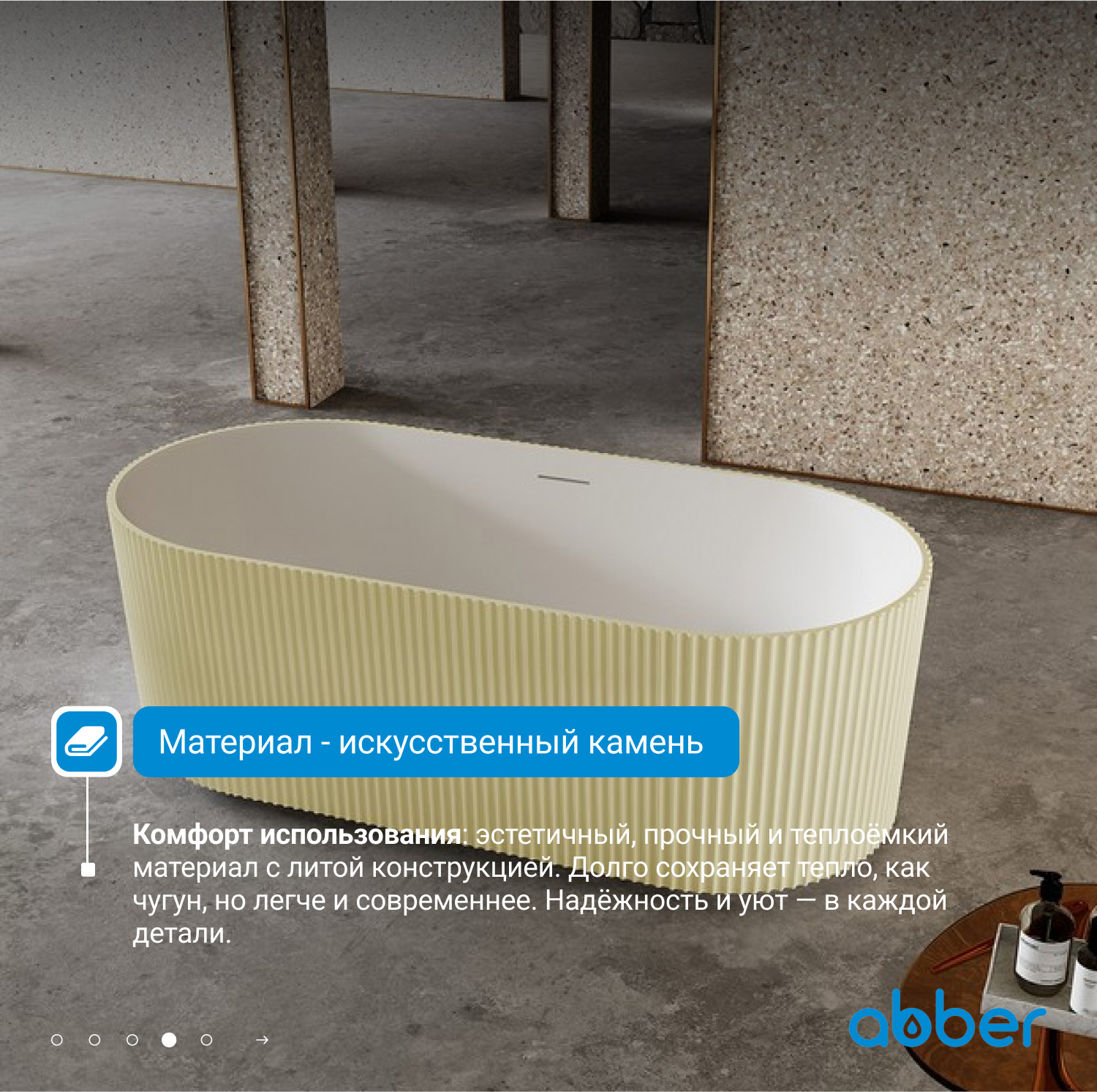 Ванна каменная Abber Stein, размер 170x75 см, слив-перелив и ножки в комплекте, цвет песочный матовый.