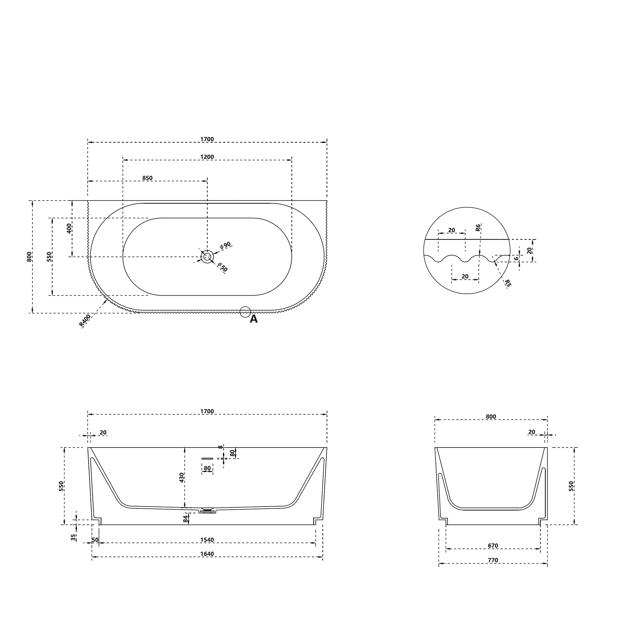 Ванна каменная Abber Stein, размер 170х75 см, слив-перелив в комплекте, цвет белый матовый.