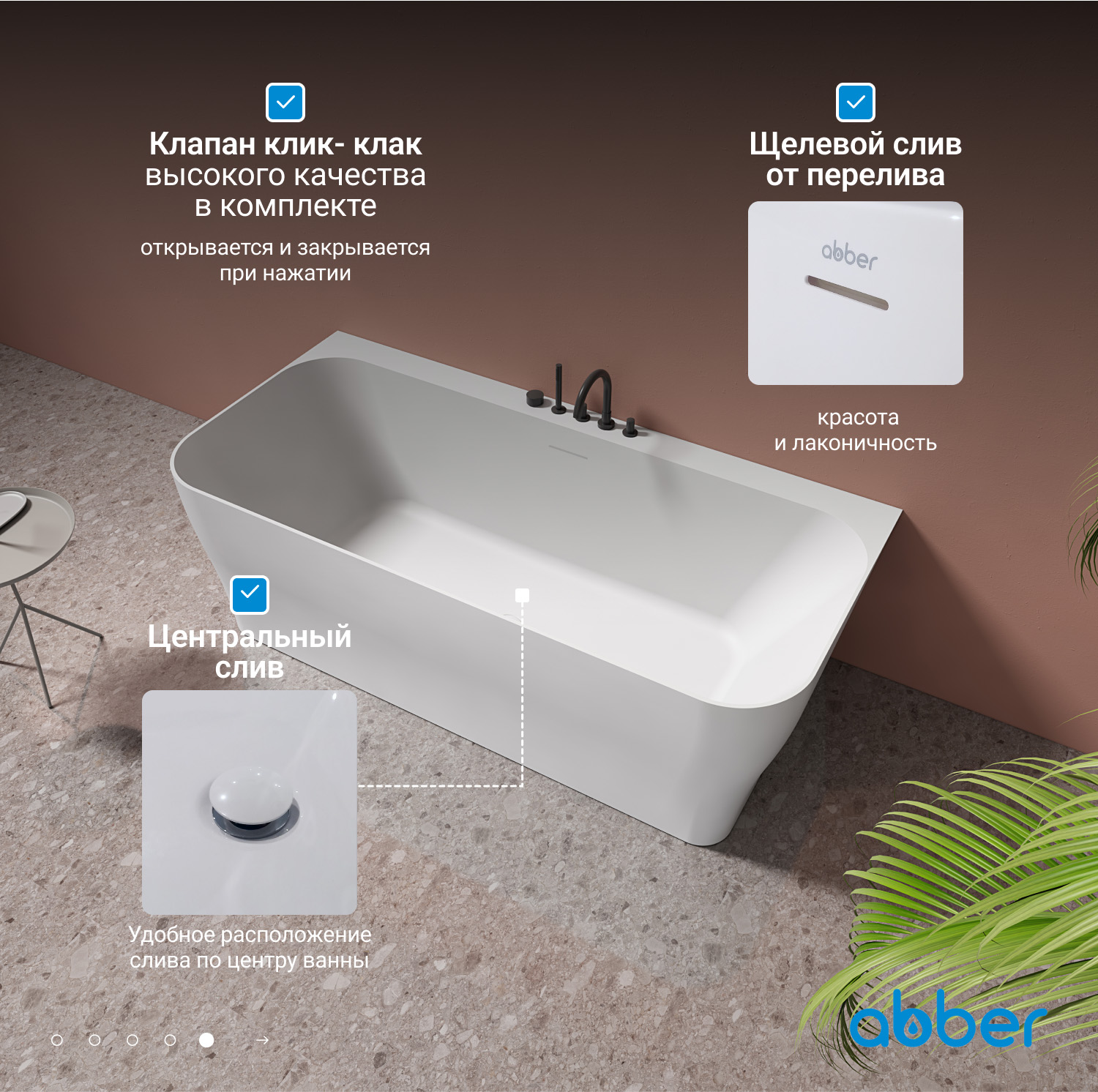 Ванна каменная Abber Stein, размер 170х80 см, слив-перелив в комплекте, цвет белый матовый.