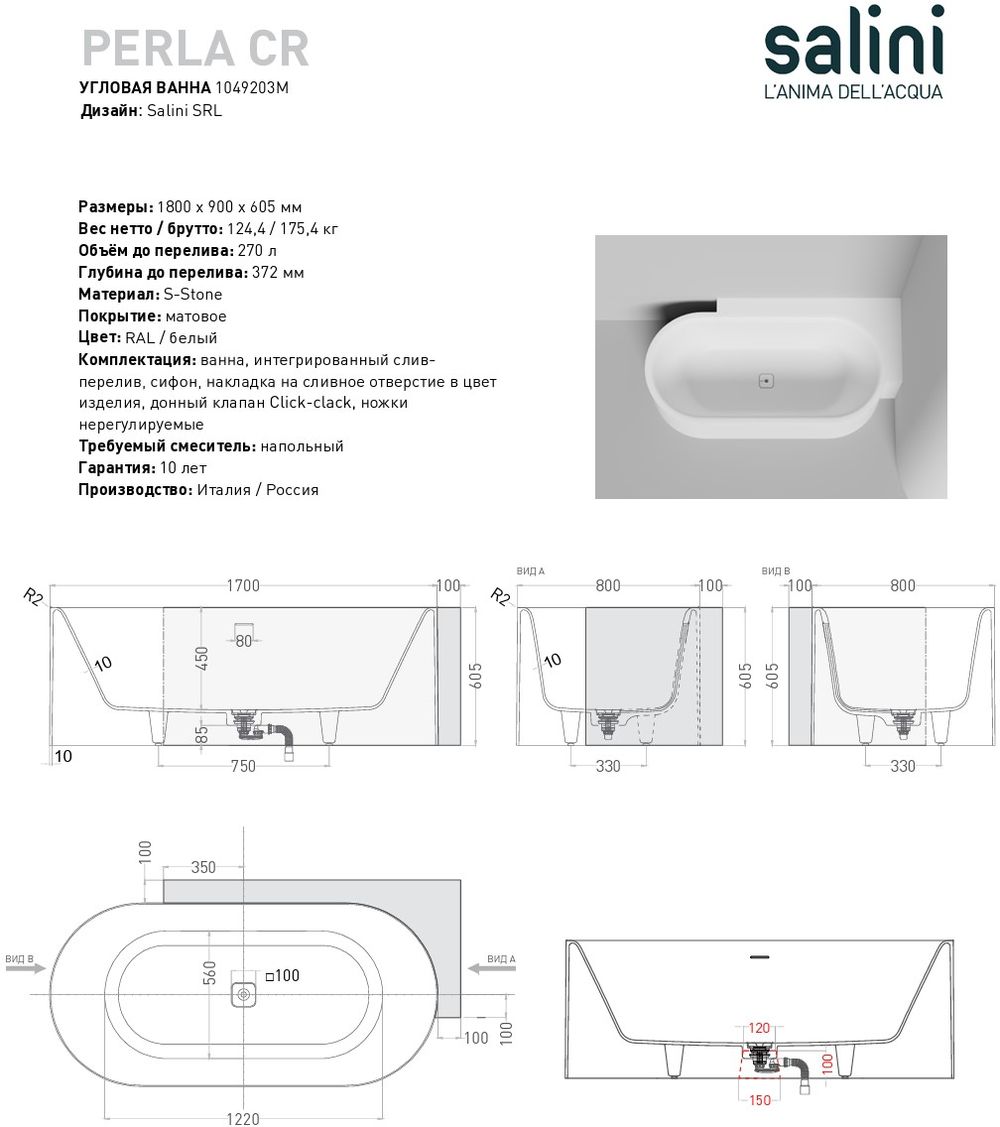 - Модель PERLA CR — угловой вариант отдельностоящей ванны PERLA в правом исполнении. Она позволяет качественно оптимизировать пространство ванной комнаты, сохранив эстетику и комфорт использования отдельностоящей модели. Ширина полок составляет 100 мм.