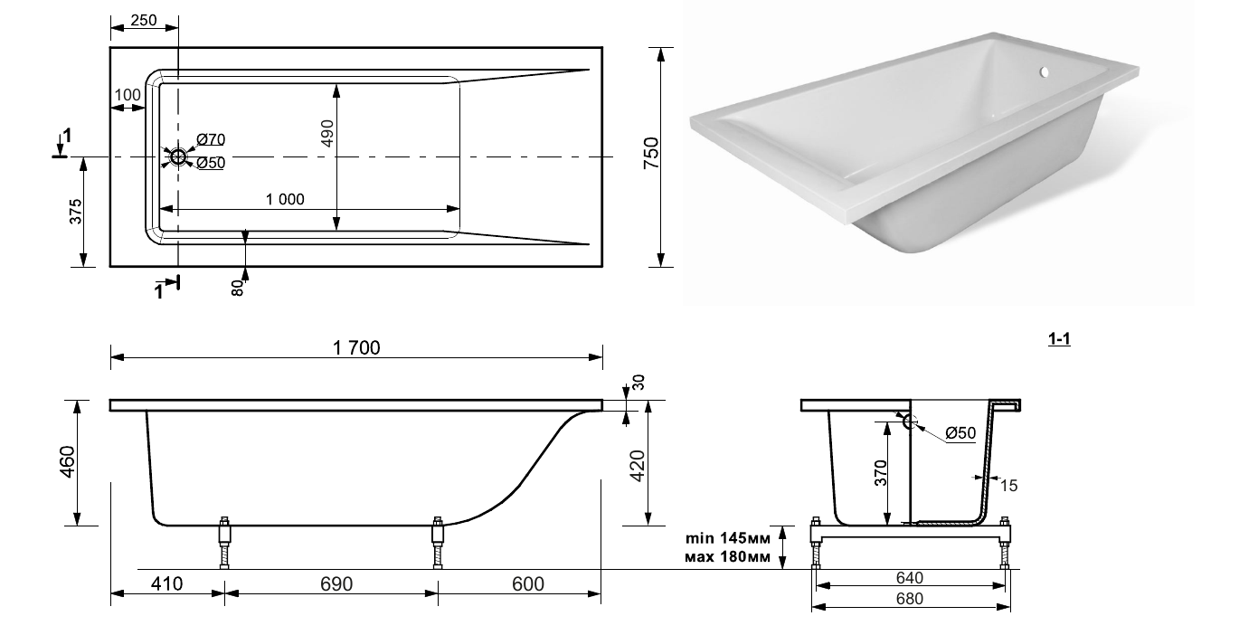 Ванна каменная Taliente Egoista EG2317075-1, размер 1700х75х595 мм, материал литьевой мрамор, цвет белый.