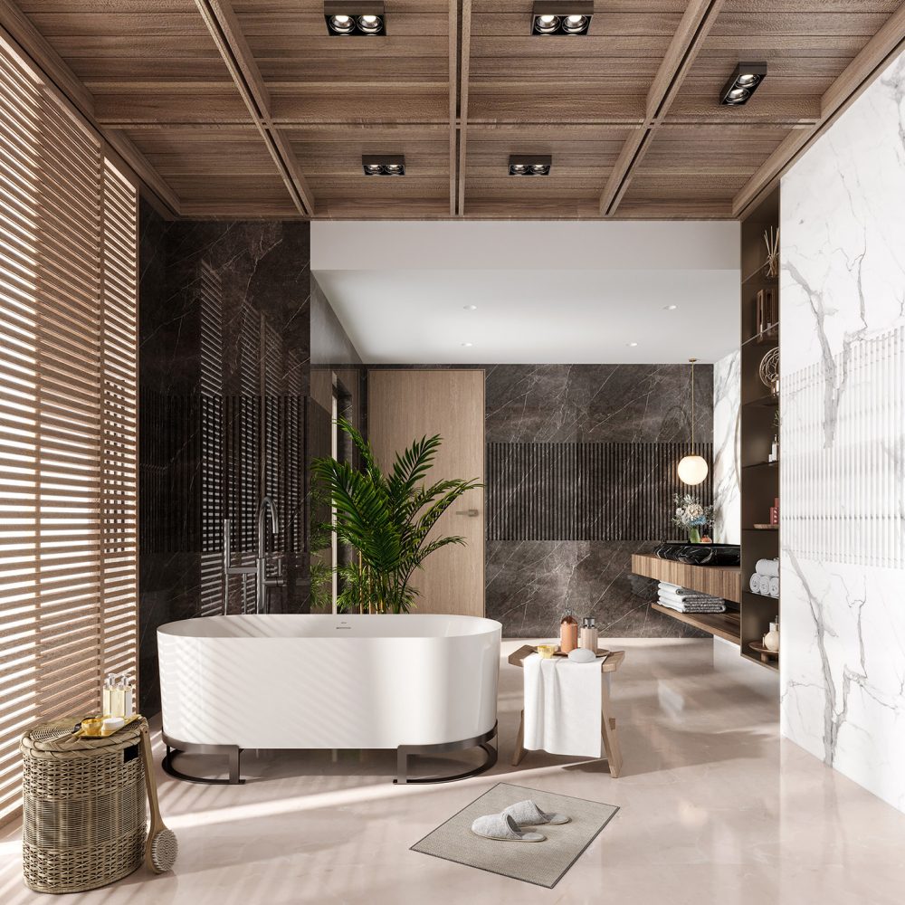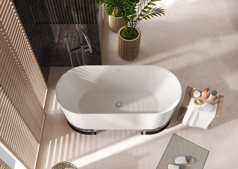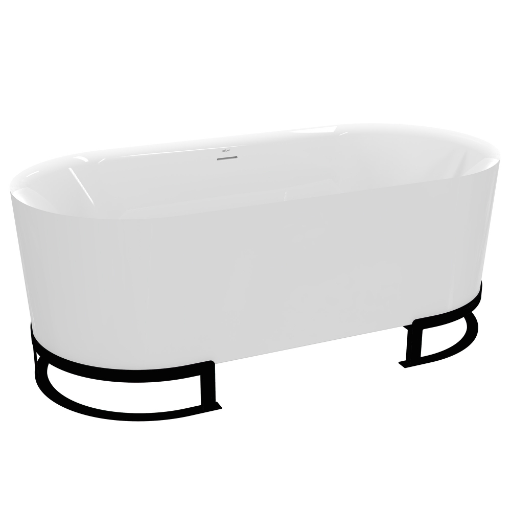 - Особого внимания заслуживает конструкция модели. Отдельностоящее исполнение позволяет разместить ванну в центре помещения — так она раскроет свой дизайнерский потенциал в полной мере. Контраст белоснежной чаши и строгих чёрных металлических ножек создаёт эффектный визуальный акцент, а продуманная форма ножек гарантирует надёжность и устойчивость всей конструкции.
