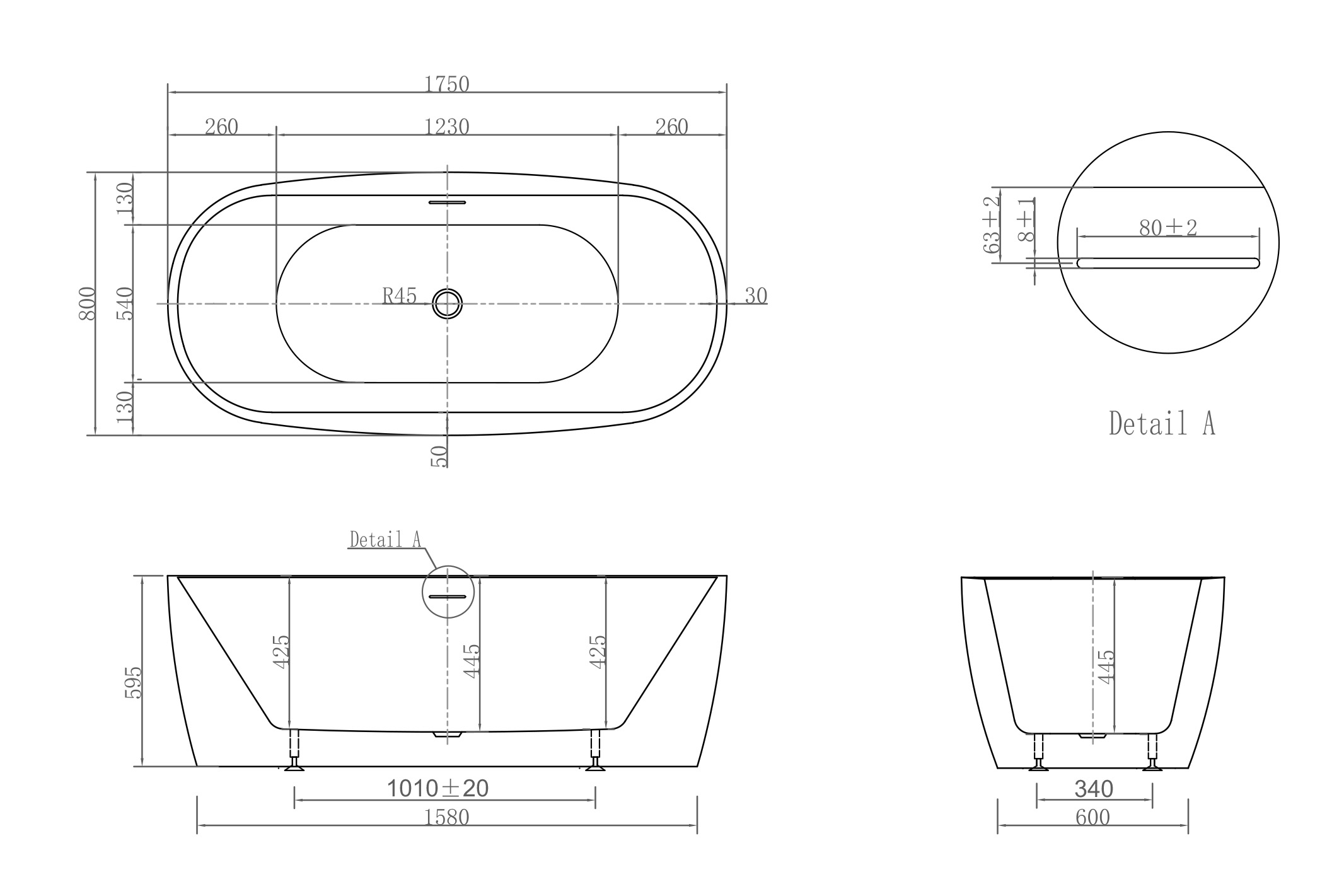 Ванна отдельностоящая Abber AB9219 175x80 см, в комплекте слив-перелив и каркас, цвет белый.