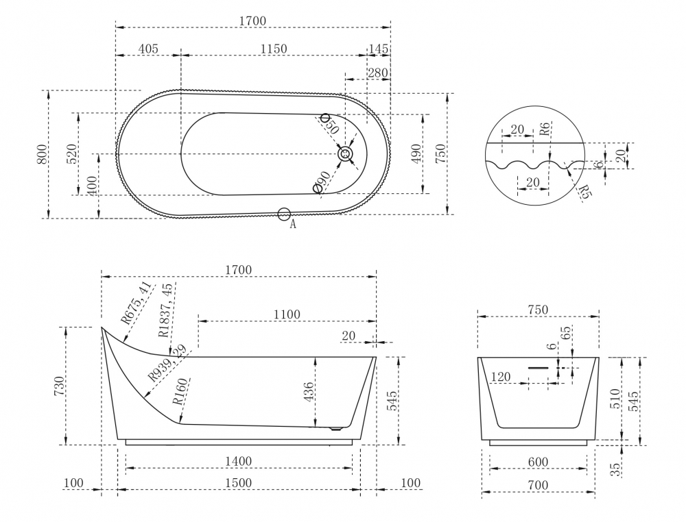Ванна отдельностоящая Abber AB9445MW, размер 170x80 см, в комплекте слив-перелив и каркас, цвет белый матовый.