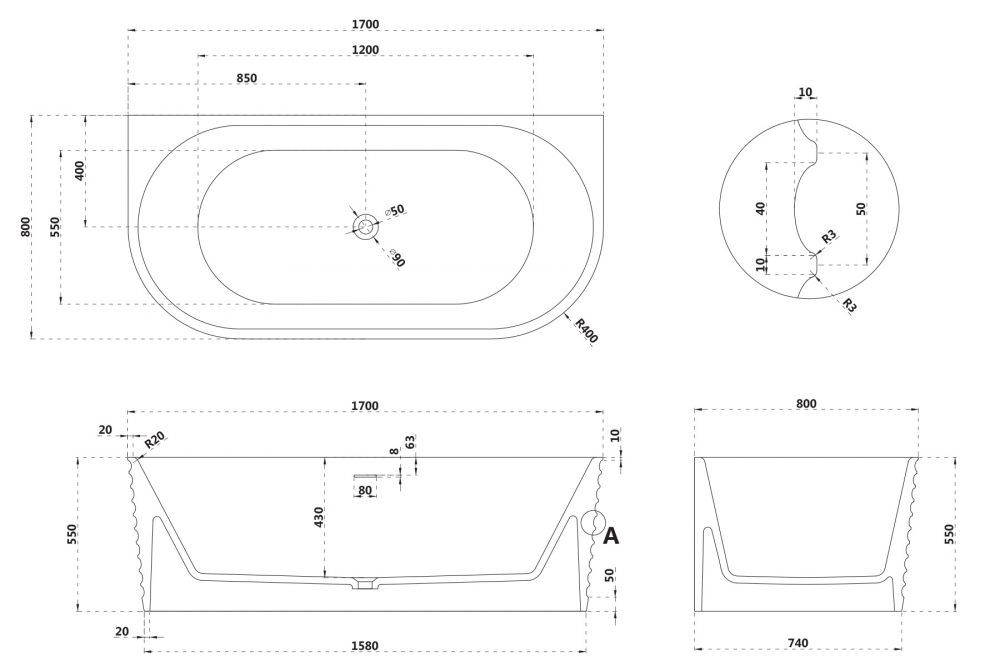 Ванна каменная Abber Stein 170x80 см AS9652, белый матовый