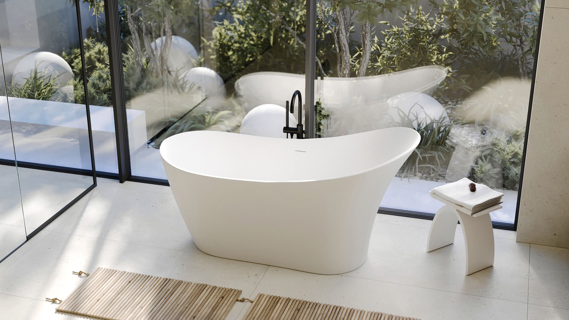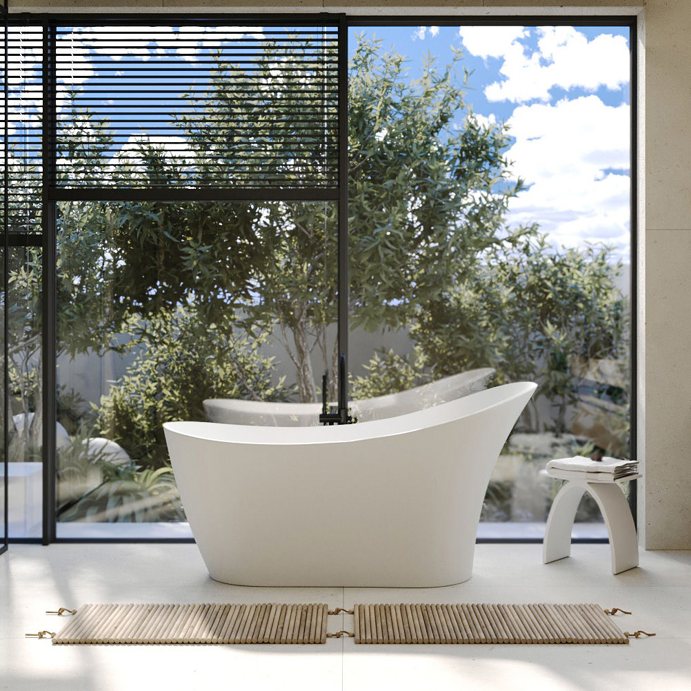 Ванна отдельностоящая Abber Stein 169x75 см AS9618 из искусственного камня, слив-перелив в комплекте, цвет - белый матовый.