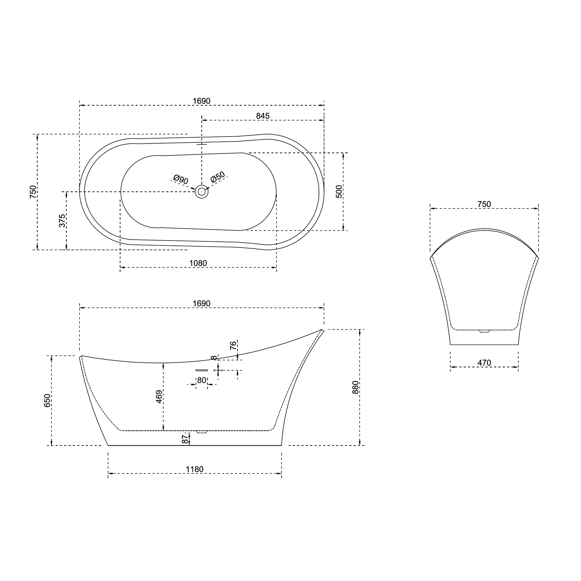Ванна отдельностоящая Abber Stein 169x75 см AS9618, белый матовый