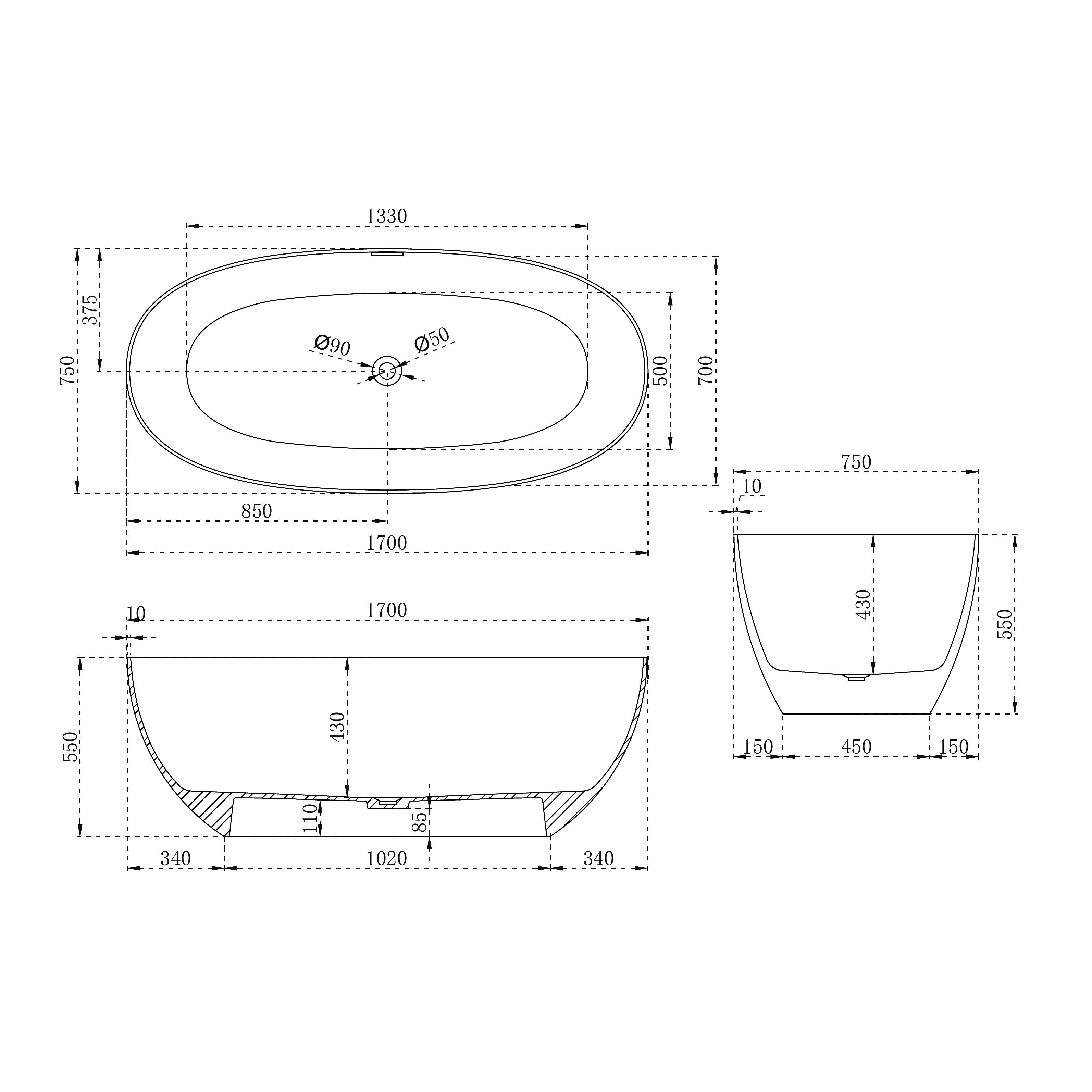 Ванна отдельностоящая Abber Stein 170x75 см AS9624-1.7 из искусственного камня, слив-перелив в комплекте, цвет - белый матовый.