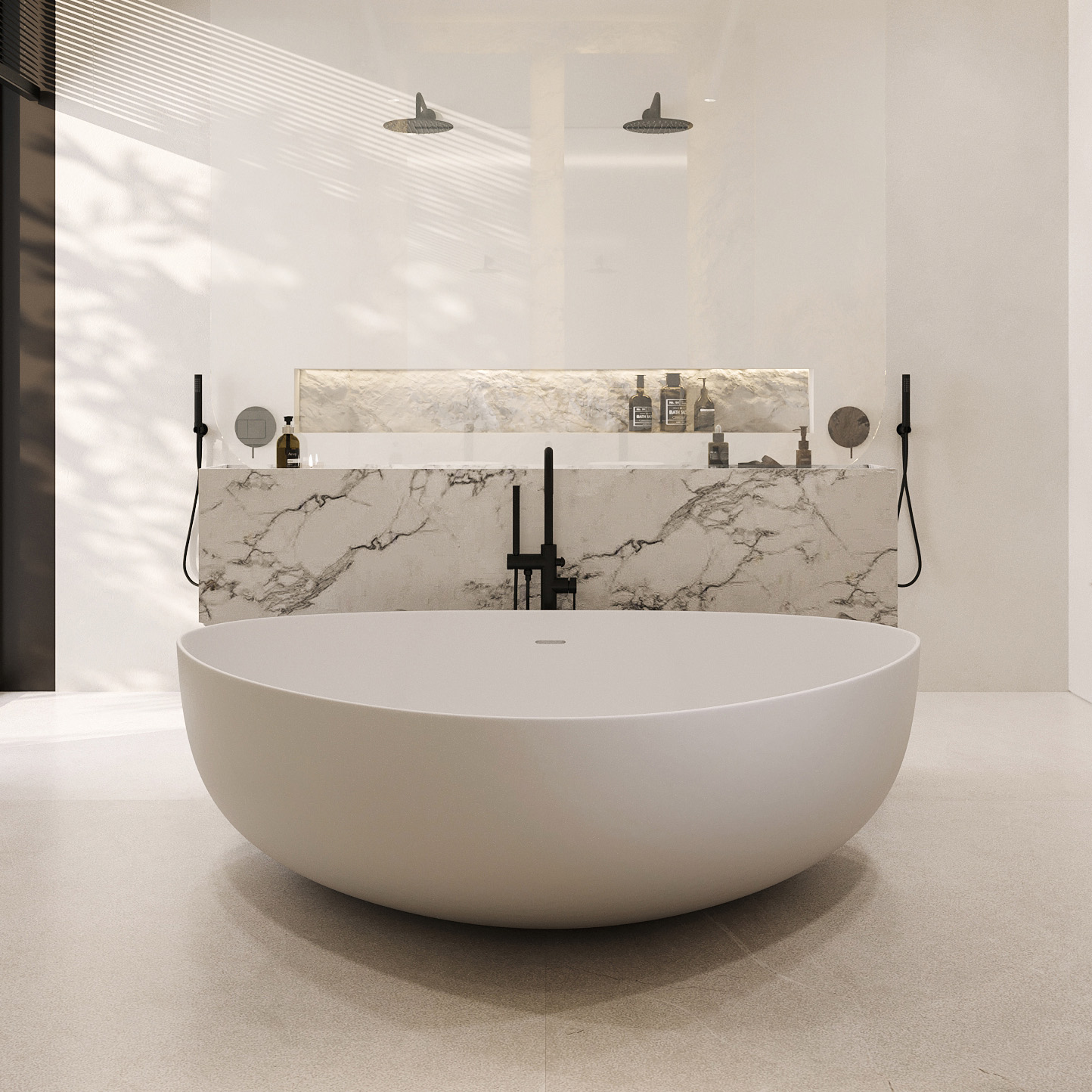 Ванна отдельностоящая Abber Stein 180x130 см AS9608 из искусственного камня, слив-перелив в комплекте, цвет - белый матовый.