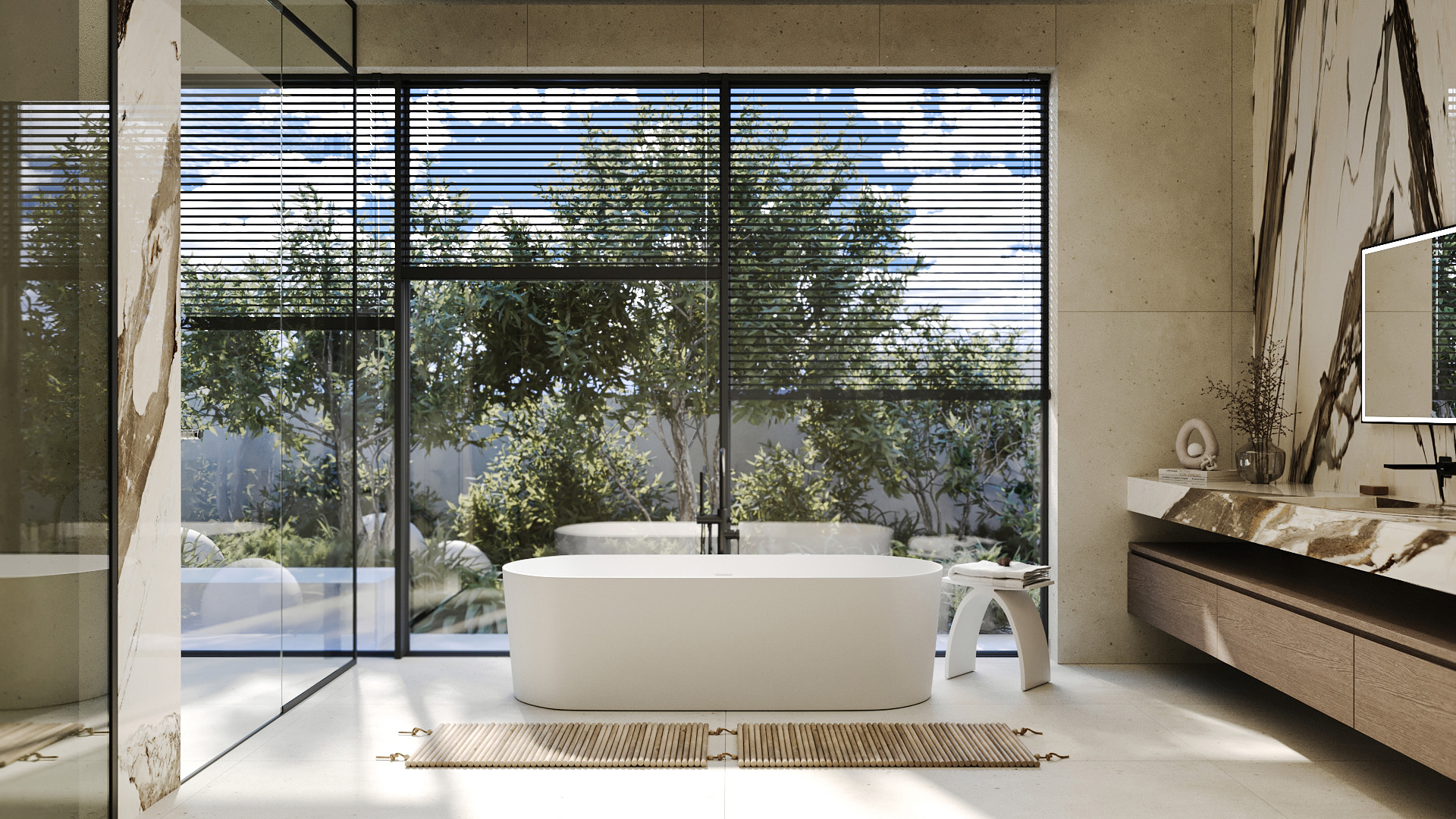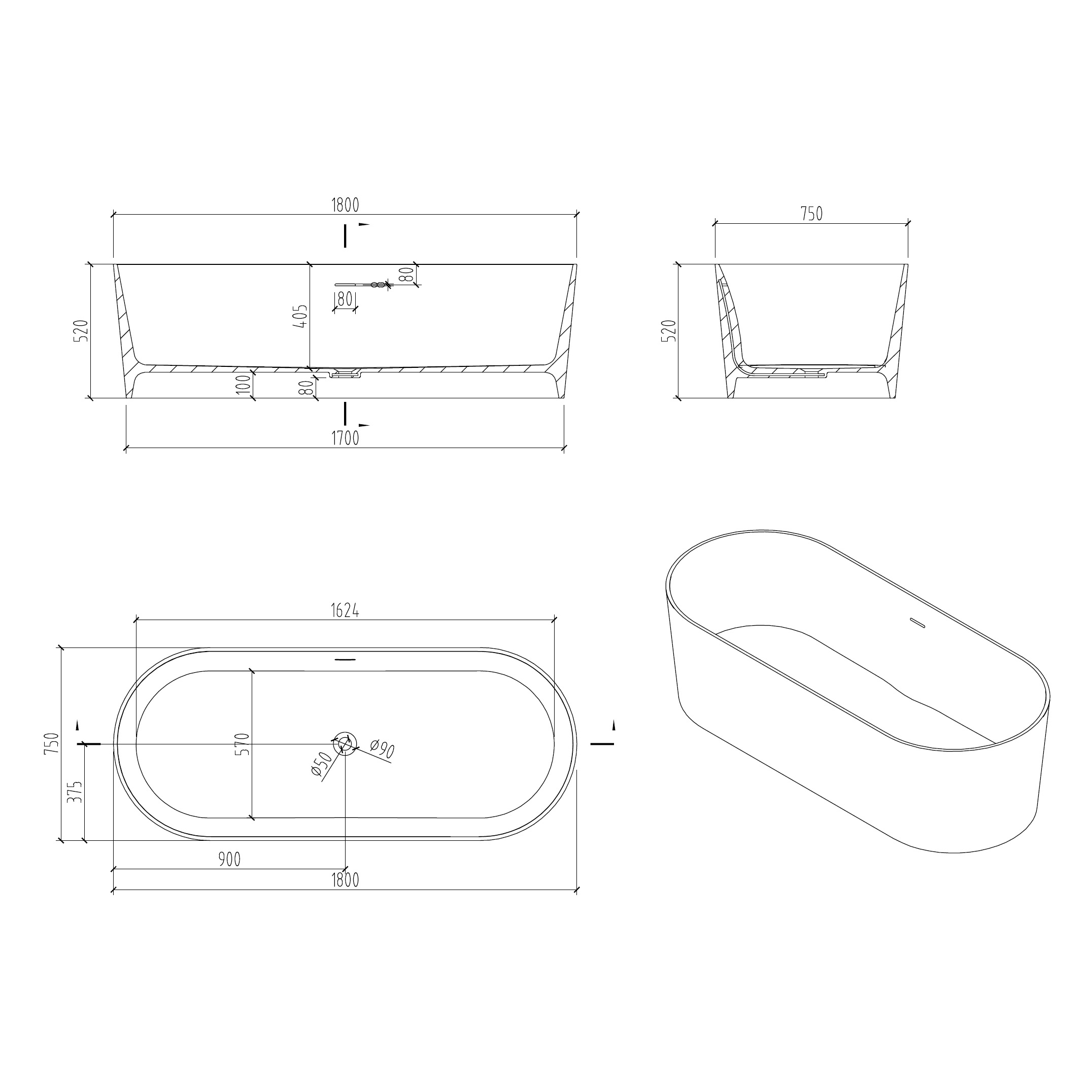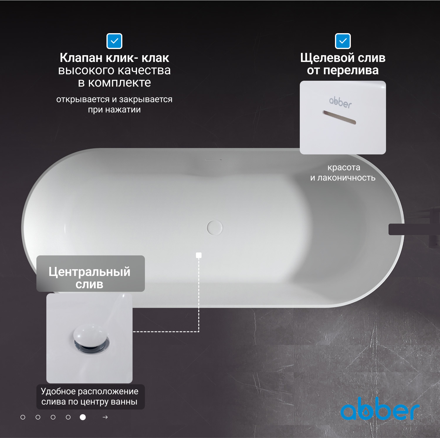 Ванна отдельностоящая Abber Stein 180x75 см AS9614 из искусственного камня, слив-перелив в комплекте, цвет - белый матовый.