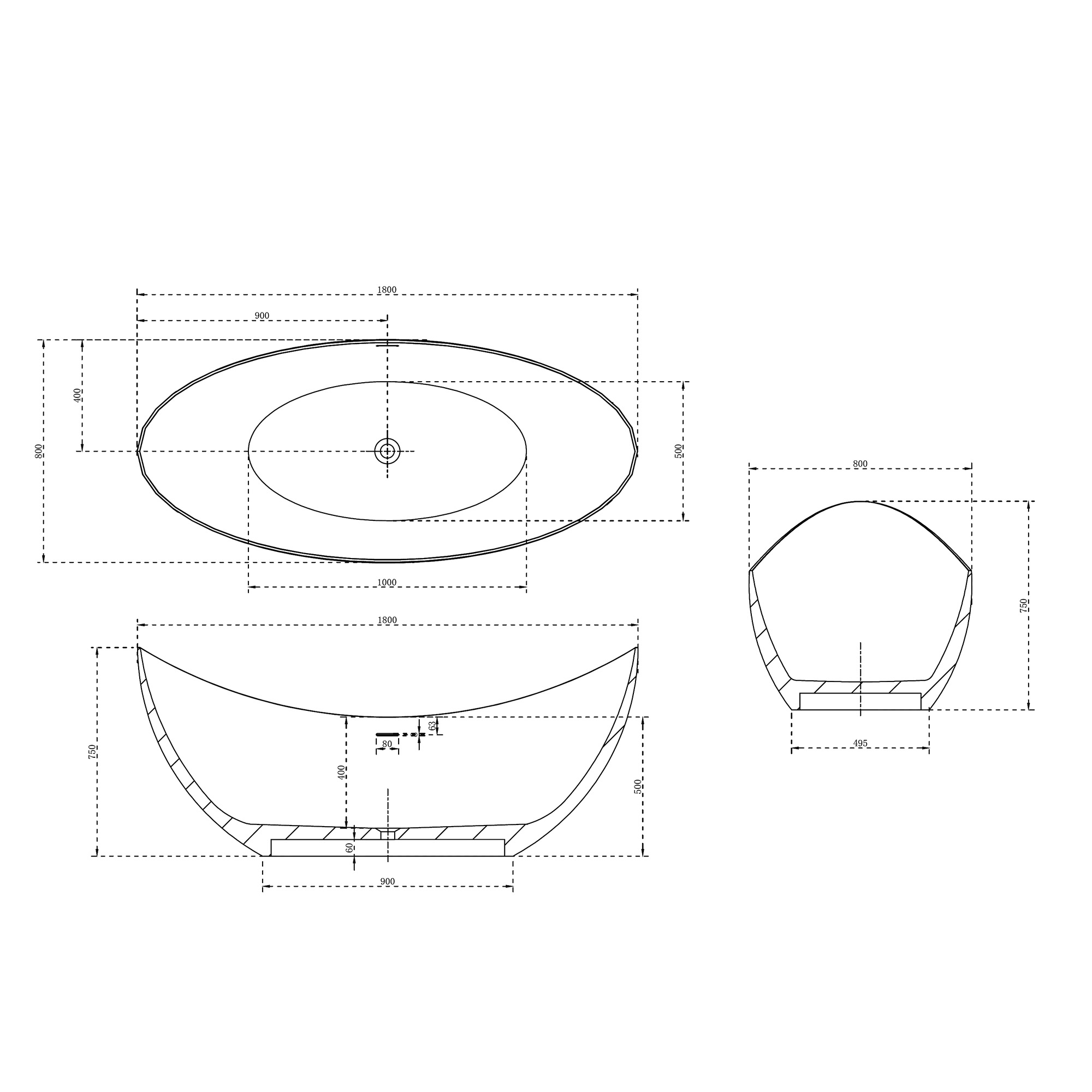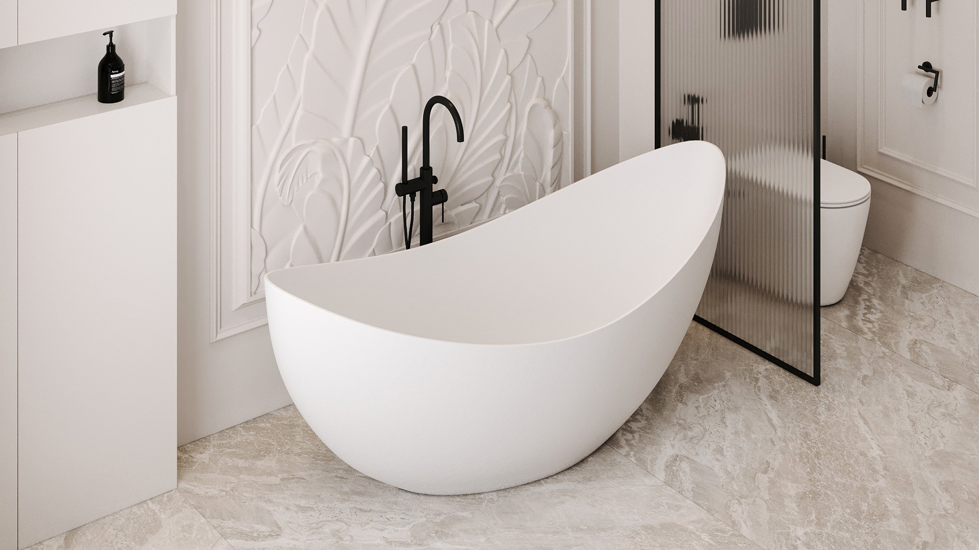 Ванна отдельностоящая Abber Stein 180x80 см AS9633 из искусственного камня, слив-перелив в комплекте, цвет - белый матовый.