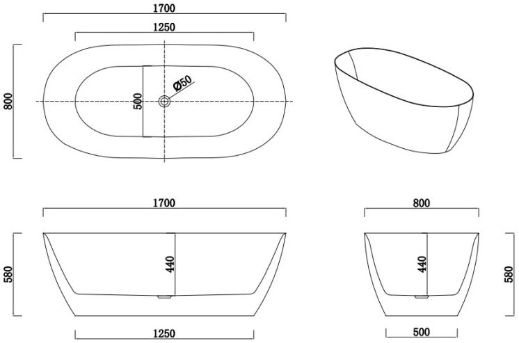 Ванна отдельностоящая AN Stella, размер 1700x800x580 мм, цвет белый.