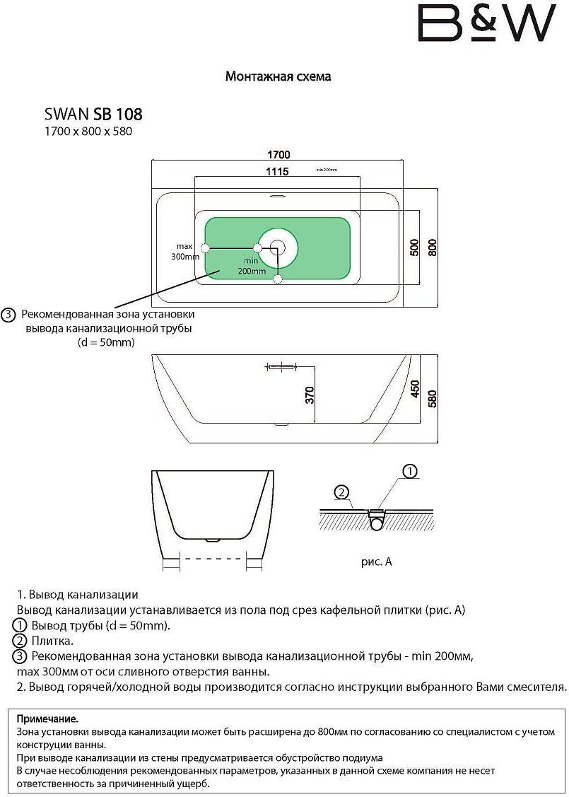 Ванна отдельностоящая Black & White Swan SB108 170x80 см