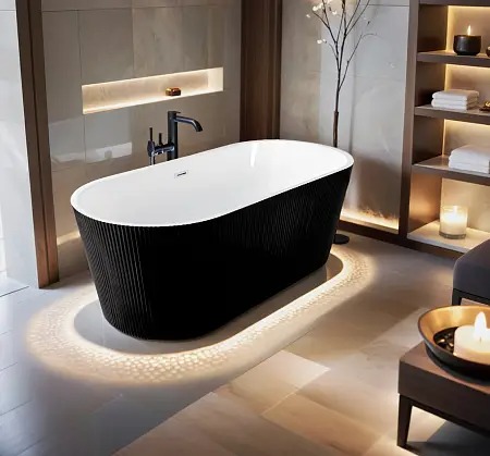 - Изысканный дизайн: Глубокий черный цвет акрила придает ванне Loranto особую глубину и элегантность, создавая атмосферу спа-салона прямо у вас дома. Ее отдельностоящая конструкция позволяет разместить ее в любом удобном месте, открывая новые возможности для планировки ванной комнаты.