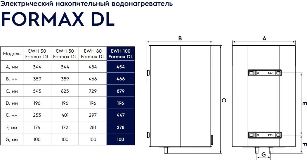 Электрический водонагреватель Electrolux EWH 100 Formax DL на 100 л. Размеры - ширина 460 мм; глубина 454 мм; высота 879 мм. Сухой тэн.
