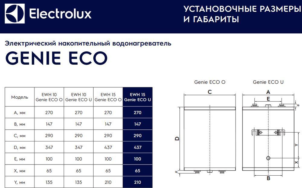 - Водонагреватели Electrolux серии EWH Genie ECO при своих скромных размерах отличаются высокой технологичностью и производительностью. Они идеальны для установки в малогабаритных помещениях и нишах, а благодаря возможности выбора моделей, как с нижним, так и с верхним подключением, прибор можно установить вне зависимости от места подвода воды.