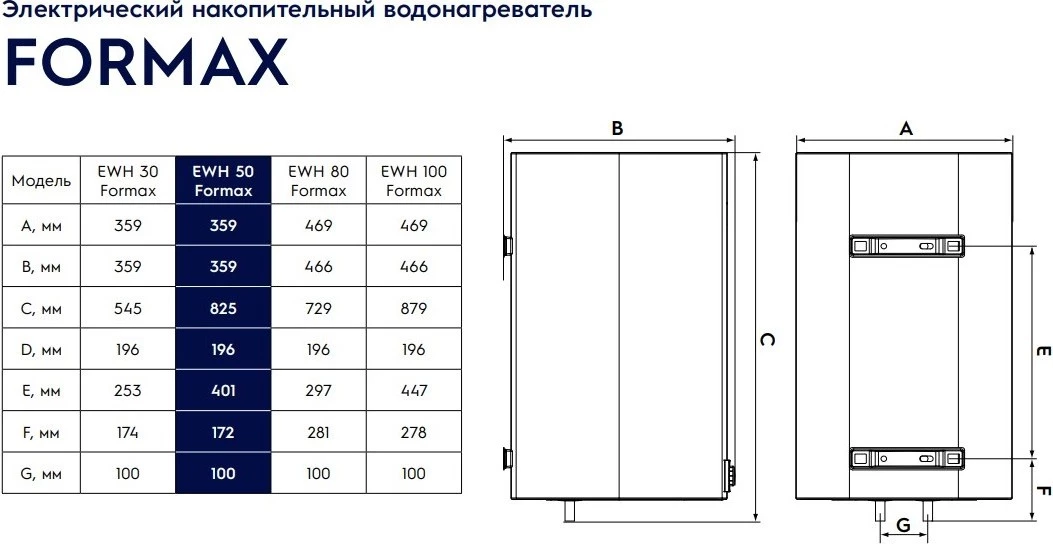 - Надежность и безопасность - за многоуровневую защиту внутреннего бака от коррозии в модели EWH 50 Formax отвечает система Protect tank, которая включает в себя специальный высокопрочный сплав, стеклоэмаль, а также магниевый анод увеличенной массы. Надежную работу водонагревателя обеспечивает предохранительный клапан с функцией слива, который защищает прибор от избыточного давления внутри бака. Для удобства и безопасности эксплуатации водонагревателя EWH 50 Formax он комплектуется Устройством Защитного Отключения. Внутри водонагревателя EWH 50 Formax установлен специальный термостат, который срабатывает при нагреве воды в баке до показателя 85°С, что обеспечивает защиту прибора от перегрева.