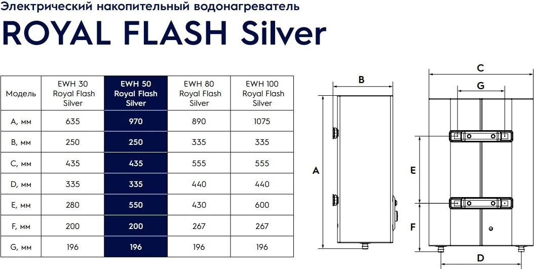 Electrolux EWH 50 Royal Flash Silver электрический накопительный водонагреватель с внутренним баком из нержавеющей стали. Все приборы серии сделаны в России с применением самых передовых технологий на современном оборудовании и имеют премиальную гарантию на внутренние баки – 8 лет.