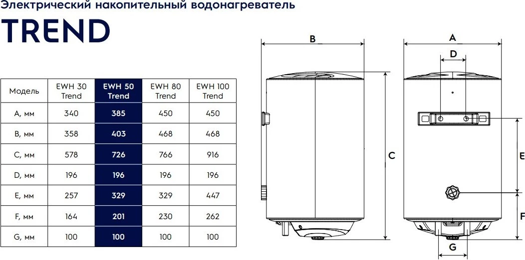 - Trend - классический круглый дизайн, ЭКО-режим, увеличивающий ресурс работы ТЭНа.