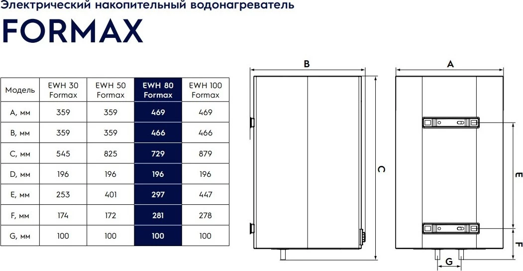 Электрический водонагреватель Electrolux EWH 80 Formax на 80 л. Размеры - ширина 469 мм; глубина 454 мм; высота 729 мм. Сухой тэн.