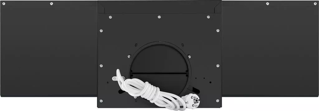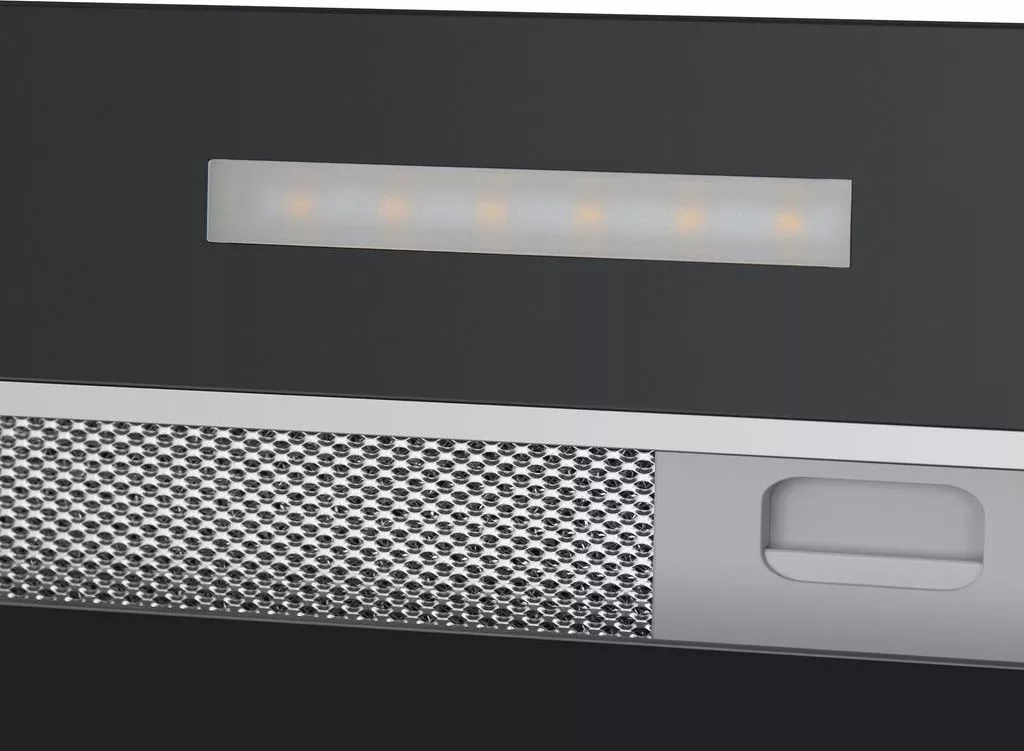- Корпус изготовлен из нержавеющей стали. На фасаде белого цвета находится откидная панель, сделанная из закаленного глянцевого стекла. За ней располагается 2 жироулавливающих алюминиевых фильтра, которые легко вынимаются для чистки. Загрязненный воздух эффективно втягивается по периметру панели