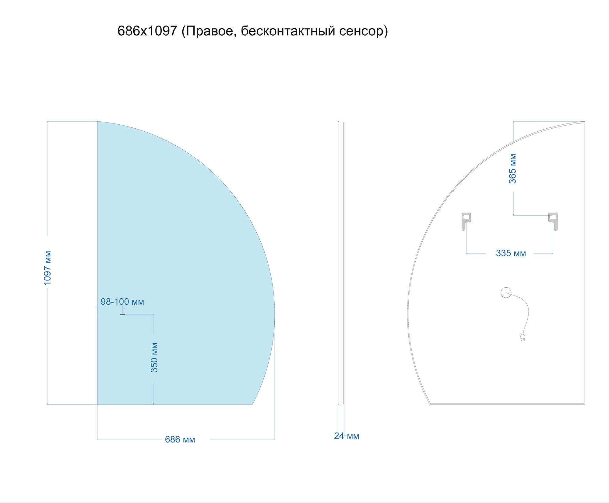 Зеркало Abber Teil AG6504SR с подсветкой, бесконтактным выключателем и диммером, правостороннее, размер 686x1097x24 мм.