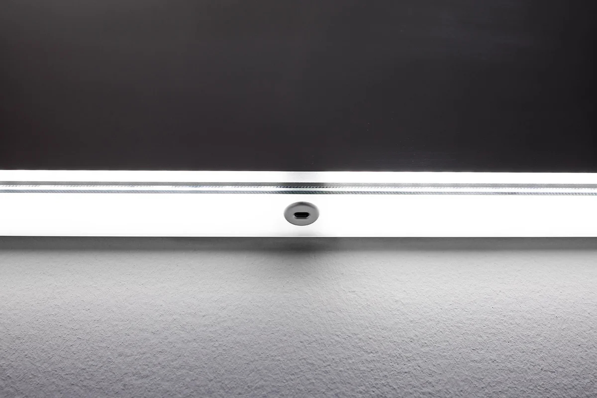- Включение и выключение светильника происходит с помощью инфракрасного датчика, а он расположен в нижней части зеркала, то есть на той стороне, которая находится напротив широкой светящейся полосы.