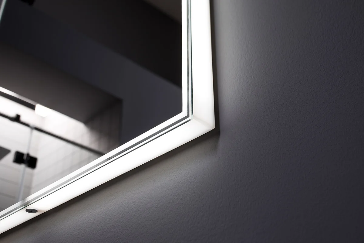 - Тоненькая светящаяся полоска по всему периметру этого четырехугольного зеркала – LED-светильник. В верхней части она перетекает в широкую рамку.