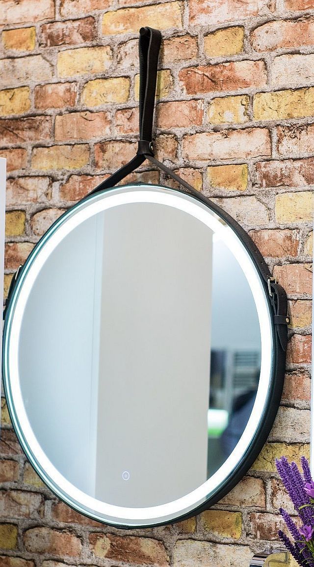 Зеркало Art&Max Milan Led 65 см AM-Mil-650-DS-F-Nero с подсветкой, диммером и сенсорным выключателем, ремень из натуральной кожи черного цвета.