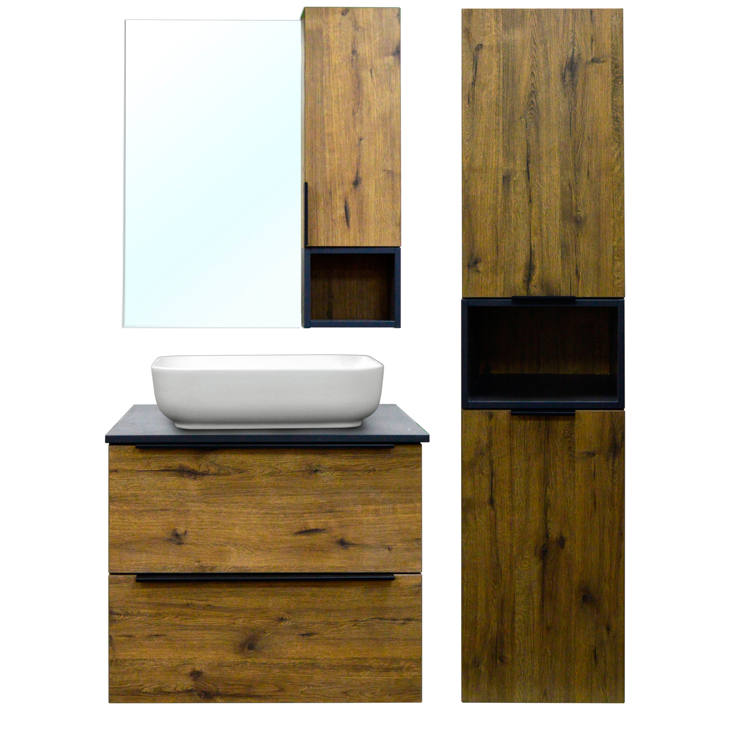 - Распашной фасад изготовлен из влагостойкого ЛДСП в цвете Дуб Веллингтон табак, полки и ниша из влагостойкого ЛДСП в цвете Антрацит