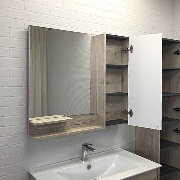 - Створка оснащена петлями с плавным закрыванием. За створкой две горизонтальные полки. Высококачественное зеркальное полотно с амальгамой на основе серебра. Удобные полочки для размещения принадлежностей для умывания. Дополнительно можно укомплектовать светильником.