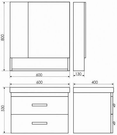 Зеркальное высококачественное полотно с амальгамой на основе серебра. Створки оснащены петлями с плавным закрыванием. Обе боковые створки зеркала открываются наружу. За широкой створкой две горизонтальные полки, за узкой одна. На нижней внешней полке можно расположить невысокие принадлежности для умывания.