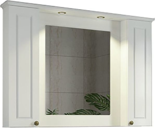 Зеркальное высококачественное полотно с амальгамой на основе серебра. Фасады мебельных элементов окрашены белой глянцевой эмалью и оснащены механизмами плавного закрывания. За створками по две полки. Верхний фриз оборудован двумя галогеновыми светильниками и выключателем.