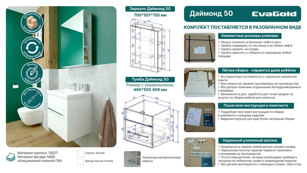 Зеркало-шкаф EvaGold Даймонд EG010337 50х70х15 см, цвет белый.