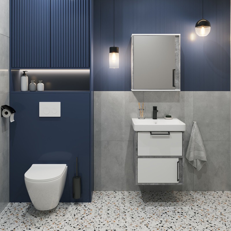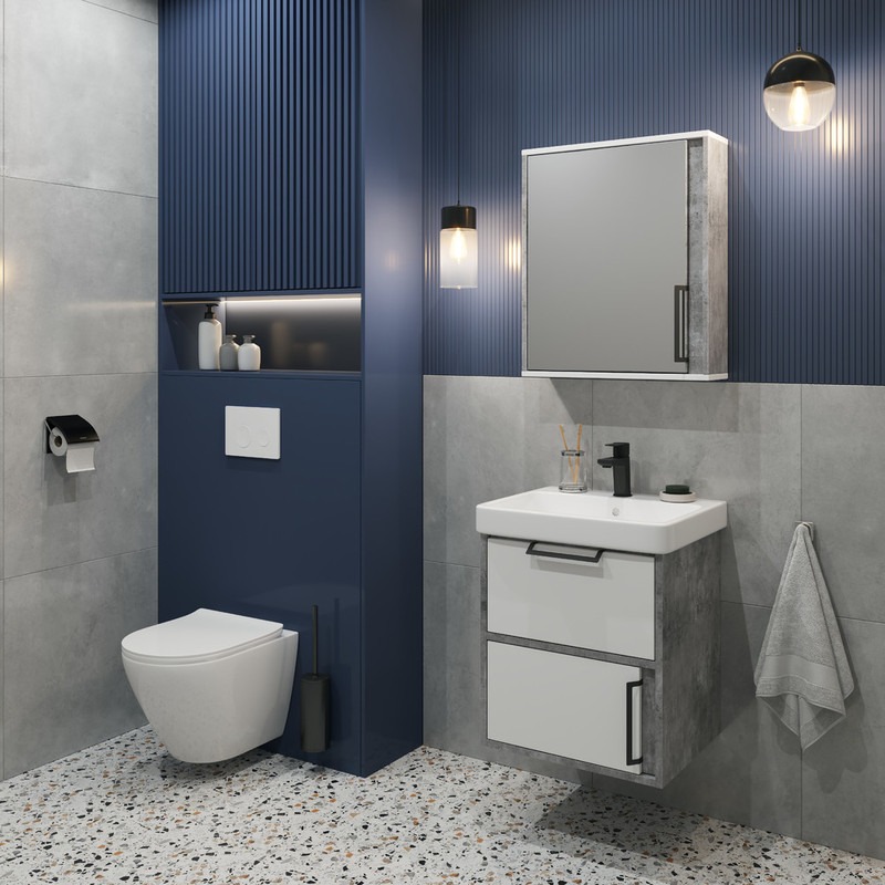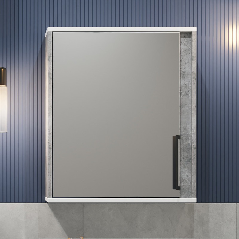 Зеркало для ванной Hunter 55 — это стильное и функциональное дополнение к вашему интерьеру. Корпус зеркала выполнен в современном цвете "светлый цемент", который привносит в пространство легкость и гармонию. Белый глянцевый фасад добавляет изделию изысканности и свежести, создавая ощущение чистоты и простора. Зеркало оборудовано тремя удобными полочками, на которых можно разместить необходимые ванные принадлежности или декоративные элементы. Для удобства использования зеркало оснащено доводчиком, обеспечивающим плавное и бесшумное закрывание. Ручка торцевая, выполненная в черном матовом цвете, придает изделию стильный акцент, подчеркивая его современный дизайн.