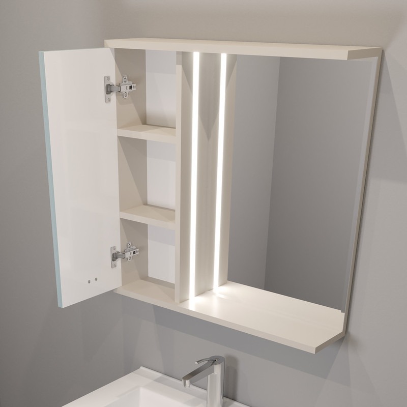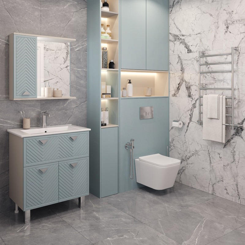 Элегантная коллекция Sky 75 для ванной комнаты выполнена в стильном сочетании благородного цвета кашемир и глубокого оттенка индиго. Корпус, оформленный в цвете кашемир, создаёт ощущение тепла и мягкости, придавая интерьеру утончённую изысканность. Фасад в насыщенном цвете индиго добавляет выразительности и динамики, создавая контраст, который привлекает внимание и подчёркивает индивидуальность дизайна. Это гармоничное сочетание оттенков идеально подойдёт для тех, кто ценит стиль и оригинальные решения в интерьере. Подсветка инновационного зеркала Sky 75 выходит за пределы обычного, встроенная в боковину шкафа и обеспечивает максимальное освещение. Рассеиватель, направленный к зеркалу, создает равномерный свет, подчеркивая вашу естественную красоту и обеспечивая идеальные условия для ежедневных рутинных процедур. И это еще не все! В профиль скрытый в боковине зеркала интегрирован сенсорный датчик с возможностью регулировки яркости подсветки, делая его использование максимально удобным и интуитивно понятным.